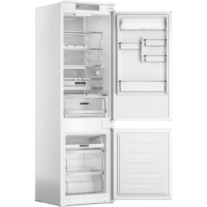 Cechy lodówki do zabudowy Whirlpool: kolor biały. Szklane półki zapewniają wytrzymałość i elegancję. Wentylator zapewnia płynny i równomierny przepływ powietrza we wnętrzu urządzenia w celu zapewnienia udoskonalonej wentylacji. Czujniki 6-ty Zmysł automatycznie obniżają temperaturę w lodówce po włożeniu nowych produktów, zmniejszając zużycie energii. Praktyczna półka do bezpiecznego przechowywania butelek.